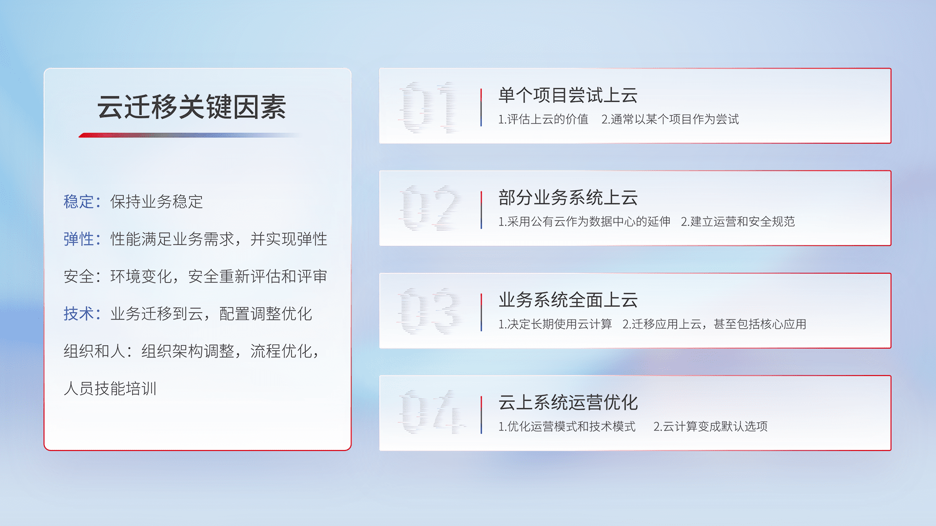 结合实际业务,,从规划设计、、、云平台选型、、云原生改造、、、、数据迁移、、、、集成交付,,迁移全过程为客户识别最佳上云路径,,,做好风险识别管理,,,,设计网络架构、、、、身份权限、、、安全审计合规、、、操作审计、、、日志审计、、、监控告警策略、、、、多站点容灾设计等,,,,对云上基础设施进行整体规划,,,,提升IT治理水平,,,以满足弹性、、高可用、、、、高性能的需求。。
