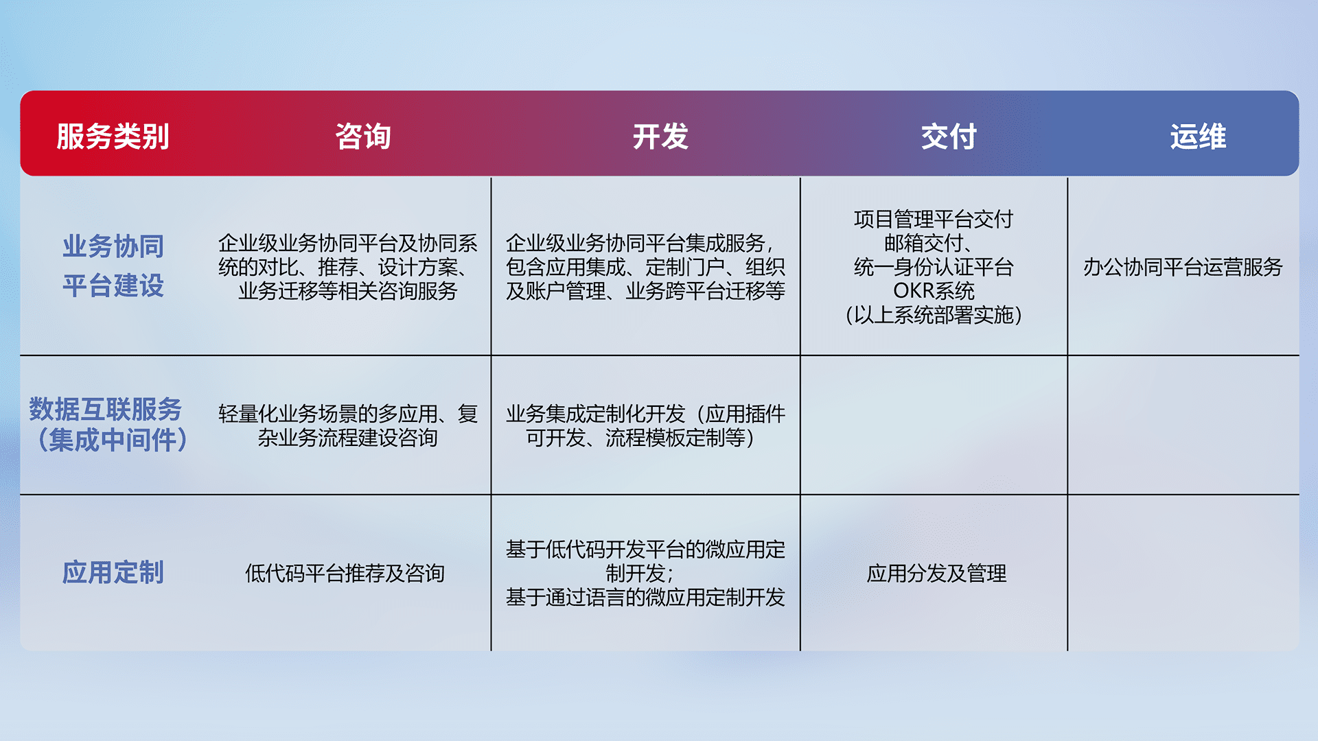针对钉钉、、、企微、、IDaas等平台级产品提供产品的规划、、、方案、、、、交付、、、、定制化开发等服务,,,实现如统一协同办公、、、智能客户服务、、混合会议管理、、、、智能数据查询、、、、等业务场景,,,实现数字化转型。。。。